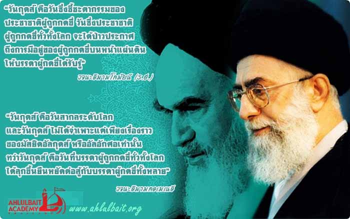 2-“วันกุดส์ คือวันสากลระดับโลก และวันกุดส์ ไม่ได้จำเพาะแค่เพียงเรื่องราวของมัสยิดอัลกุดส์ หรืออัลอักศอเท่านั้น ทว่าวันกุดส์ คือวันที่บรรดาผู้ถูกกดขี่ทั่วทั้งโลก ได้ลุกขึ้นยืนหยัดต่อสู้กับบรรดาผู้กดขี่ทั้งหลาย”