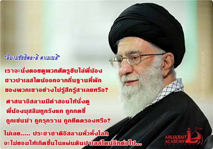 โอ้บรรดาพี่น้องชาวปาเลสไตน์เอ๋ย….. โอ้บรรดาพี่น้องชาวปาเลสไตน์ที่ถูกคุมขังอยู่ในห้องขังแคบๆ ของรัฐบาลเถื่อนอิสราเอลเอ๋ย…. อย่าได้มีความรู้สึกว่าพวกท่านโดดเดี่ยวเพื่อที่ท่านจะได้ลุกขึ้นสู้กับศัตรู การออกมาแสดงพลังในวันอัลกุดส์ การรำลึกถึงอัลกุดส์ในวันศุกร์สุดท้ายของเดือนรอมฎอน คือการสนับสนุน การให้กำลังใจแก่บรรดาสตรี บุรุษ คนหนุ่มสาว และเด็กๆ ชาวปาเลสไตน์ที่กำลังถูกตามล่า ถูกทุบ ถูกตี โดยทหารอิสราเอลตามซอกซอยต่างๆ ในฉนวนกาซ่าเขตยึดครองของอิสราเอล เพื่อที่พวกเขาจะได้ลุกขึ้นยืนหยัดต่อสู้